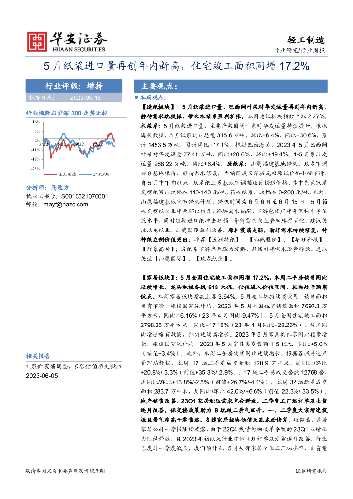 华安证券:轻工制造行业周报:5月纸浆进口量再创年内新高,住宅竣工面积同增17.2%.pdf