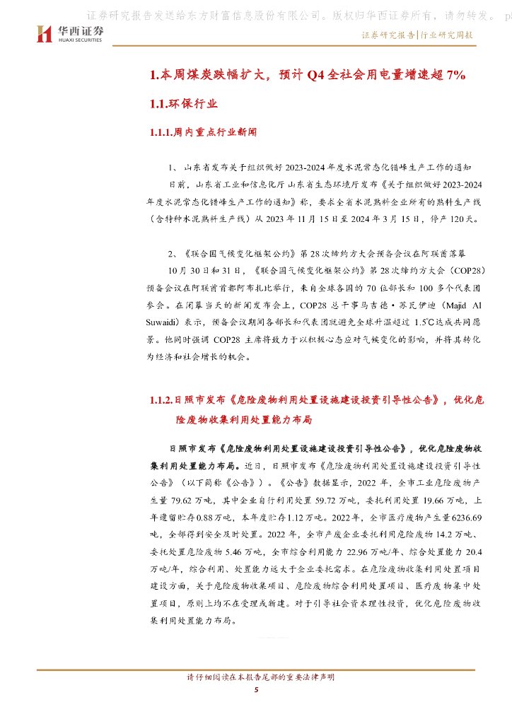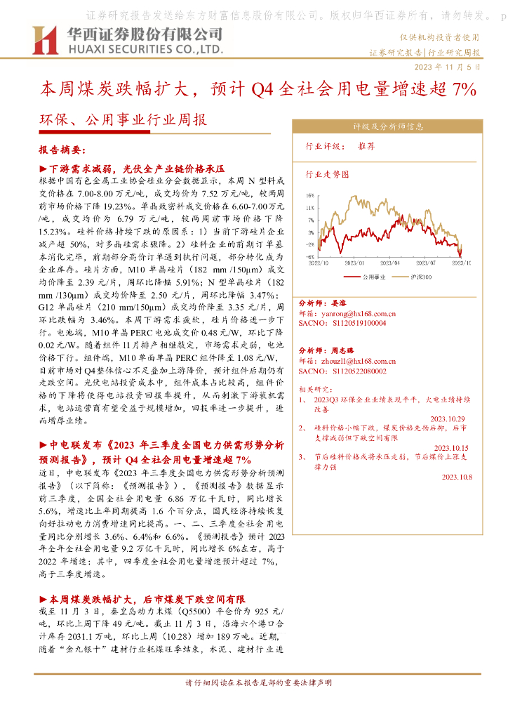 华西证券:环保、公用事业行业周报:本周煤炭跌幅扩大,预计Q4全社会用电量增速超7%.pdf