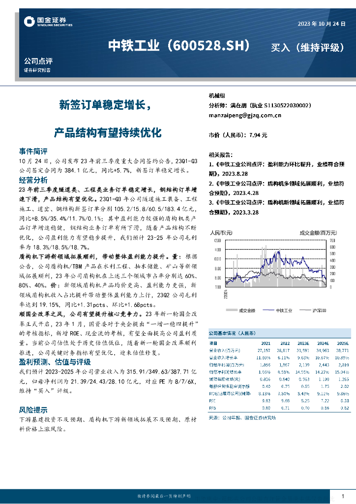 国金证券:中铁工业(600528)-新签订单稳定增长,产品结构有望持续优化.pdf
