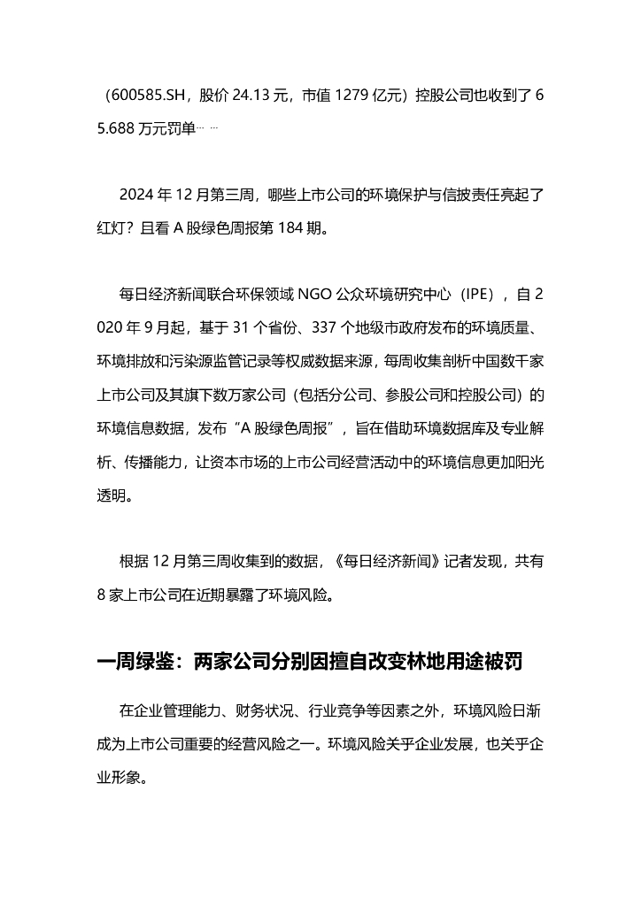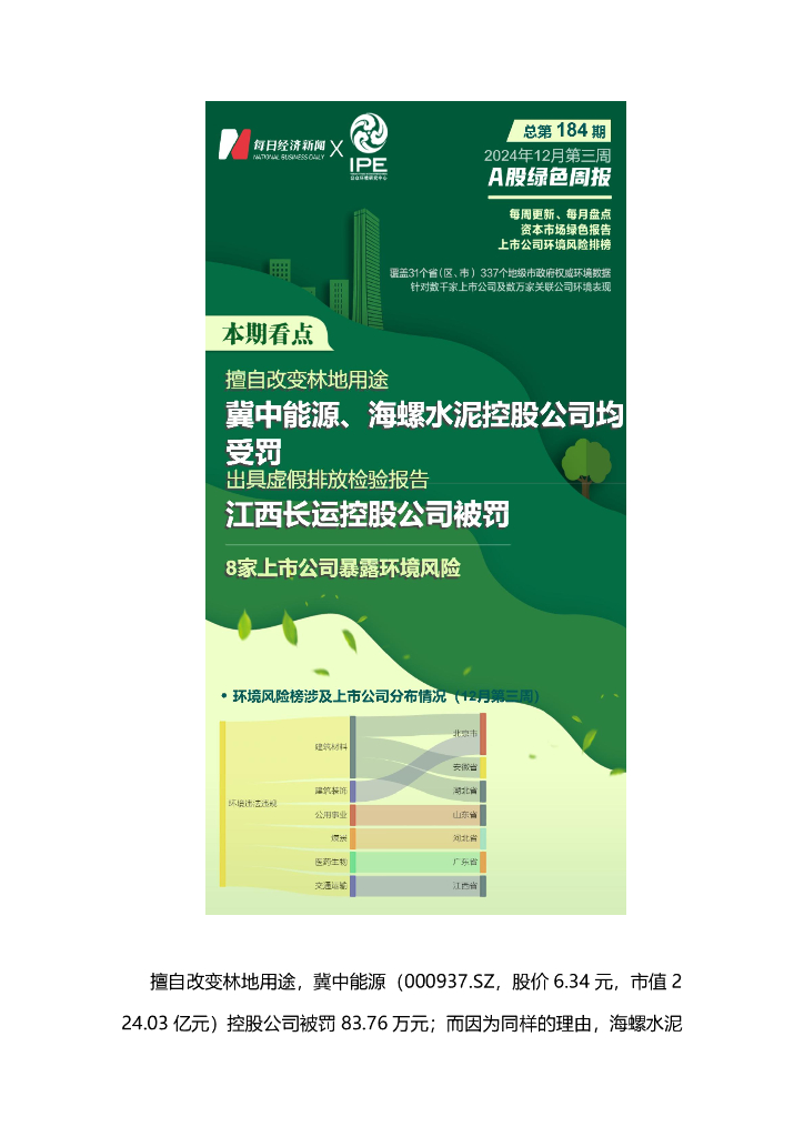 A股绿色周报(2024年12月第三周 总第184期):8家上市公司暴露环境风险 冀中能源、海螺水泥控股公司被罚.pdf