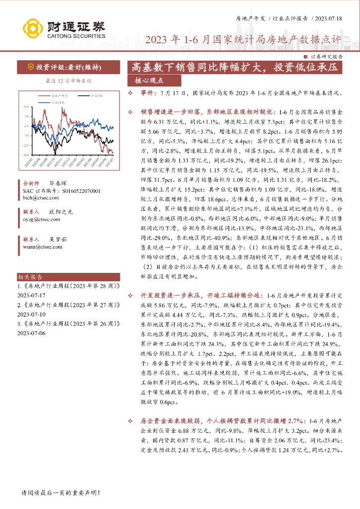 财通证券:2023年1-6月国家统计局房地产数据点评:高基数下销售同比降幅扩大,投资低位承压.pdf