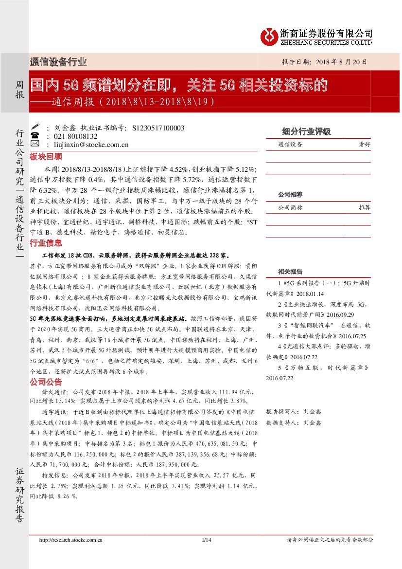 浙商证券:通信周报:国内5G频谱划分在即,关注5G相关投资标的.pdf