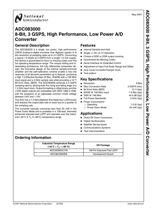 NATIONAL SEMICONDUCTOR ADC083000 8-Bit, 3 GSPS, High Performance, Low Power A/D Converter 数据手册.pdf
