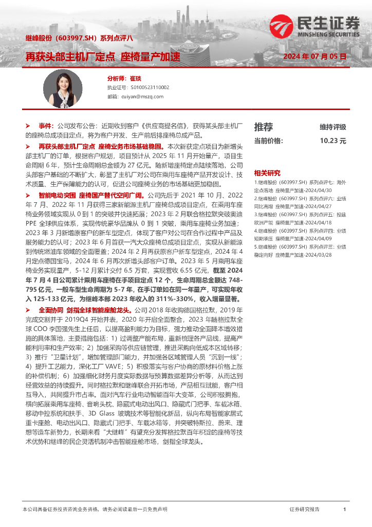 民生证券:继峰股份(603997)-系列点评八:再获头部主机厂定点座椅量产加速.pdf