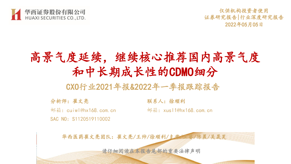 华西证券:CXO行业2021年报&2022年一季报跟踪报告:高景气度延续,继续核心推荐国内高景气度和中长期成长性的CDMO细分.pdf