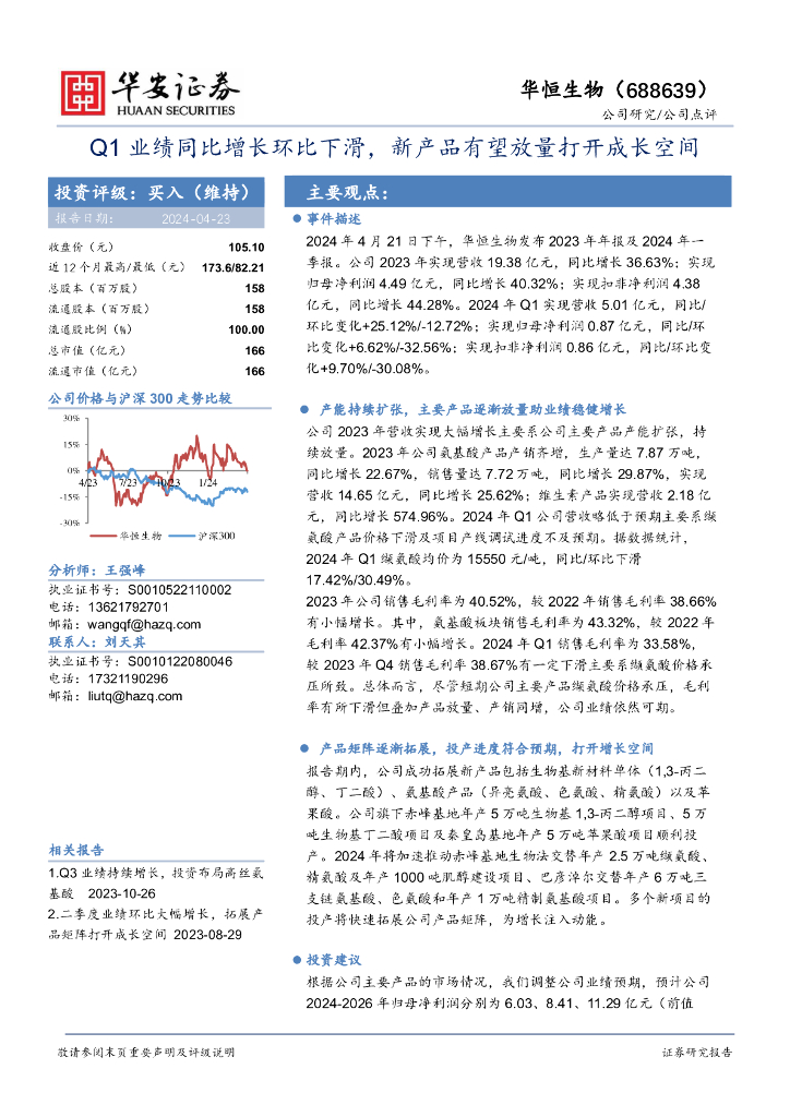 华安证券:华恒生物(688639)-Q1业绩同比增长环比下滑,新产品有望放量打开成长空间.pdf