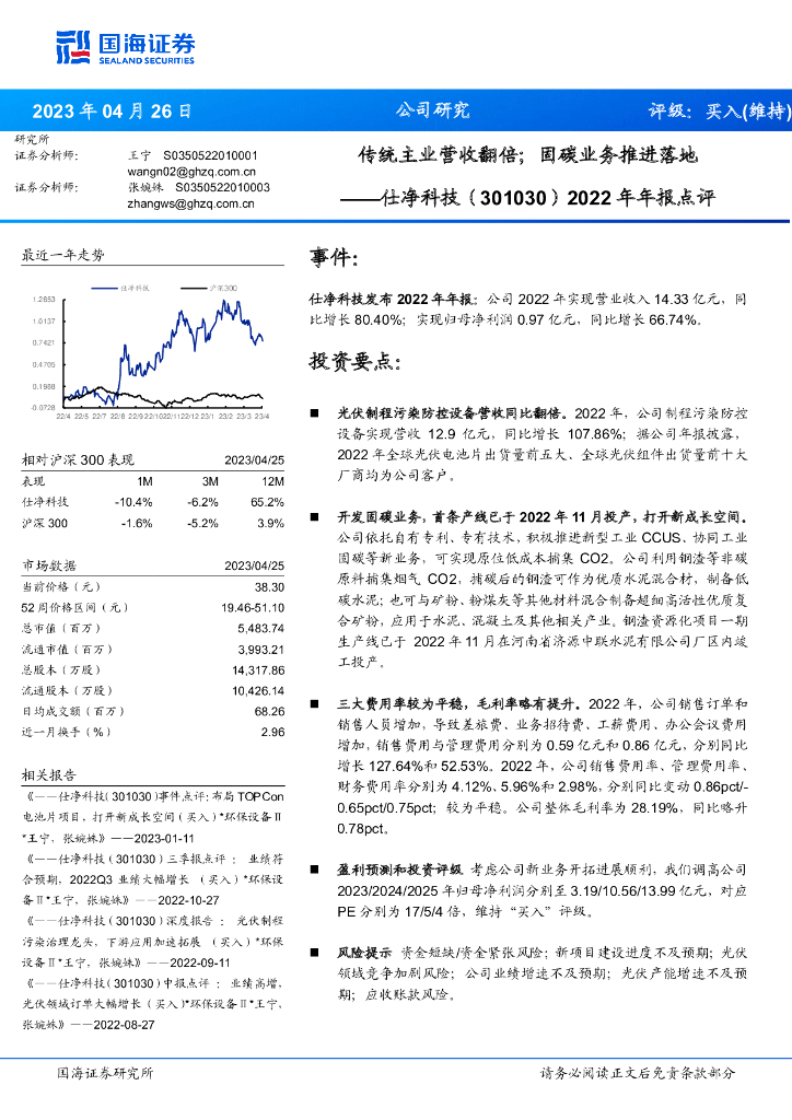 国海证券:仕净科技(301030)-2022年年报点评:传统主业营收翻倍;固碳业务推进落地.pdf