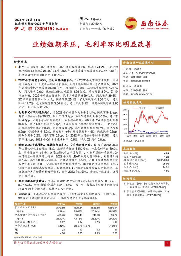 西南证券:伊之密(300415)-业绩短期承压,毛利率环比明显改善.pdf
