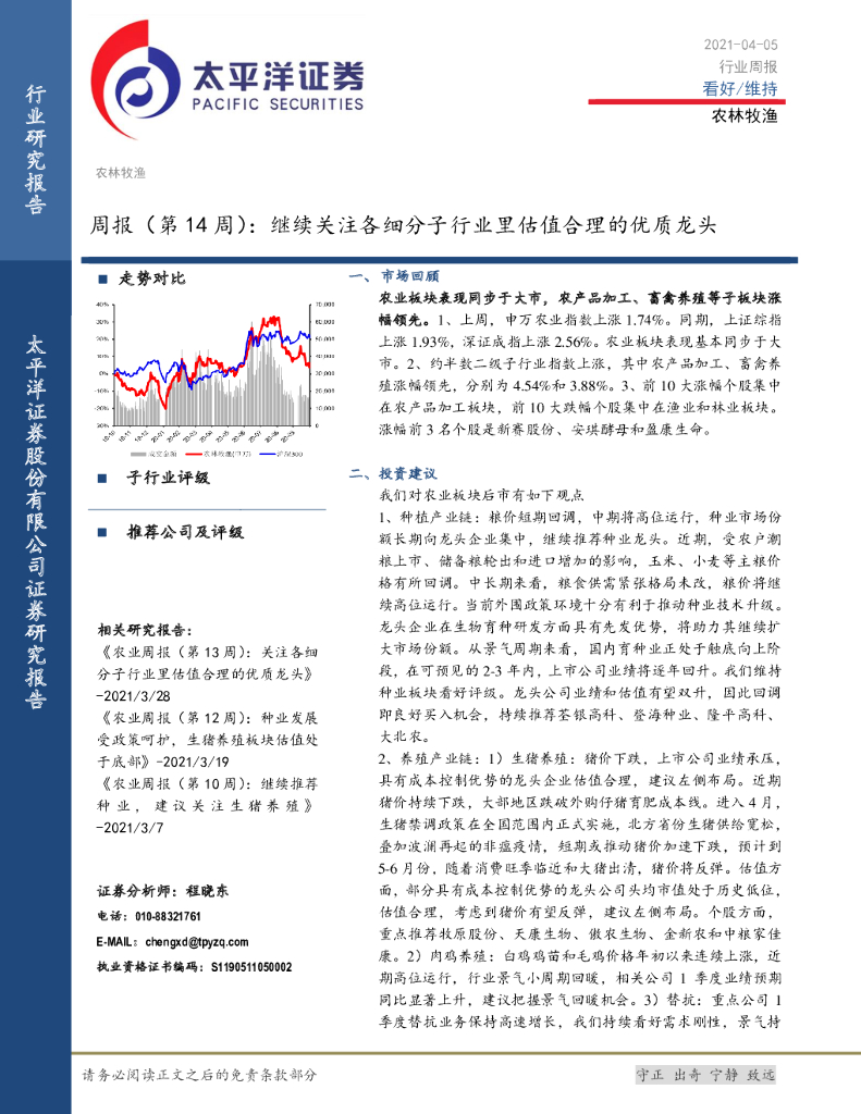 太平洋证券:农林牧渔周报(第14周):继续关注各细分子行业里估值合理的优质龙头.pdf