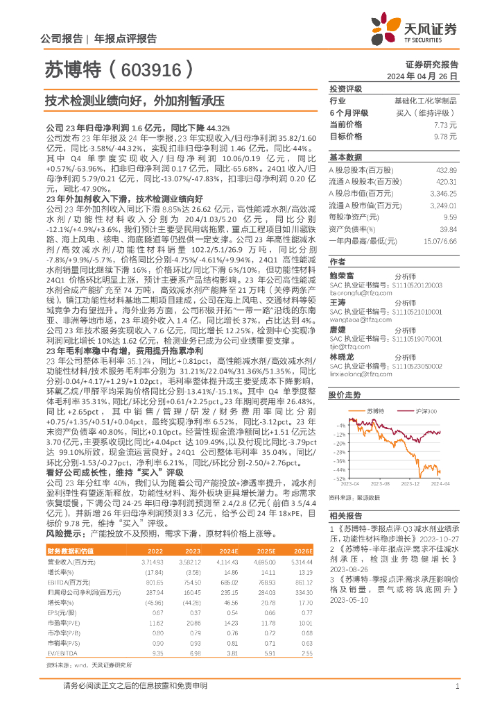 天风证券:苏博特(603916)-技术检测业绩向好,外加剂暂承压.pdf