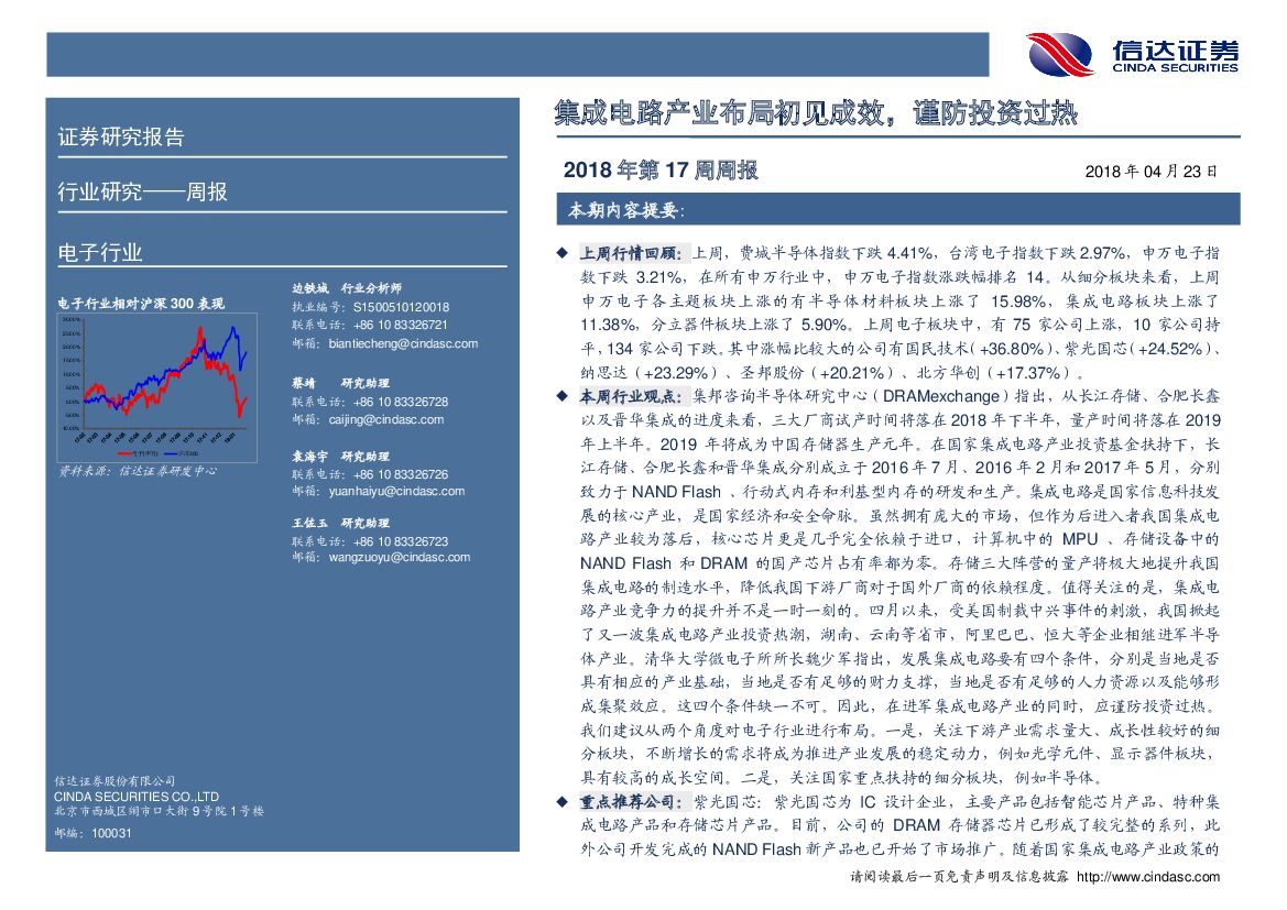 信达证券:电子行业2018年第17周周报:集成电路产业布局初见成效,谨防投资过热.pdf