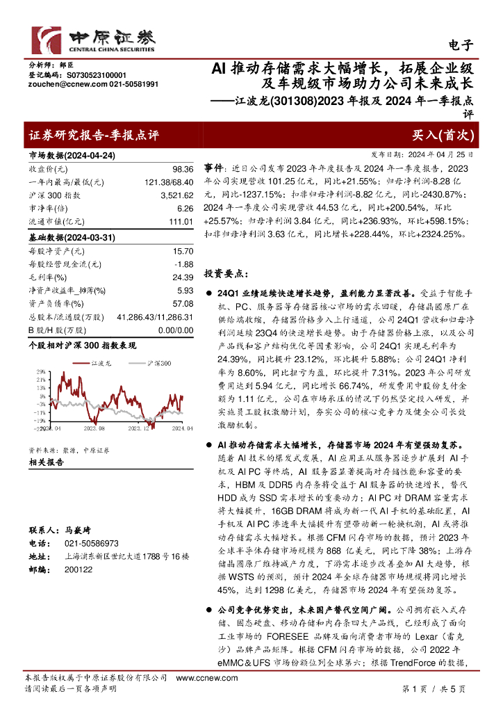 中原证券:江波龙(301308)-2023年报及2024年一季报点评:AI推动存储需求大幅增长拓展企业级及车规级市场助力公司未来成长.pdf