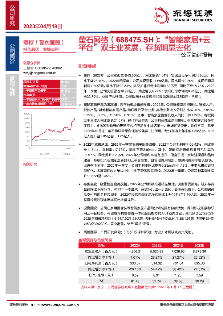 东海证券:萤石网络(688475)-公司简评报告:“智能家居+云平台”双主业发展,存货明显去化.pdf