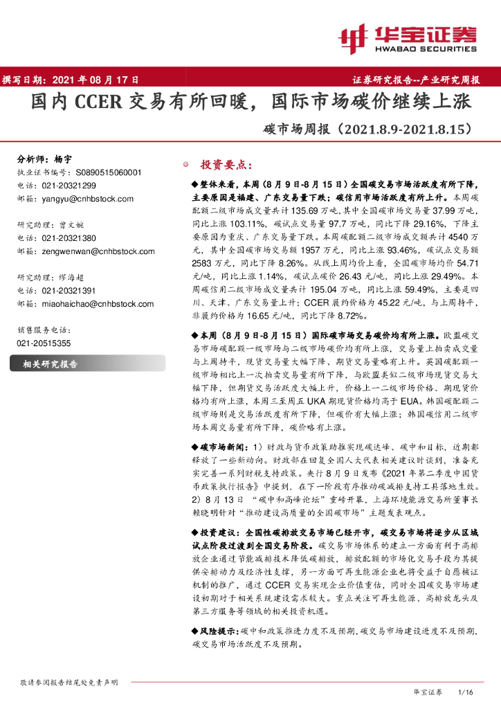 华宝证券:碳市场周报:国内CCER交易有所回暖,国际市场碳价继续上涨.pdf