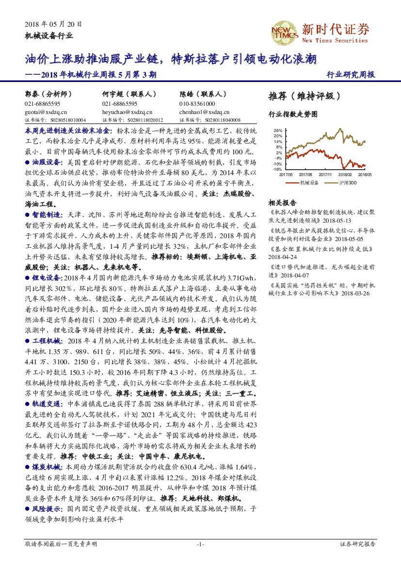 新时代证券:2018年机械行业周报5月第3期:油价上涨助推油服产业链,特斯拉落户引领电动化浪潮.pdf