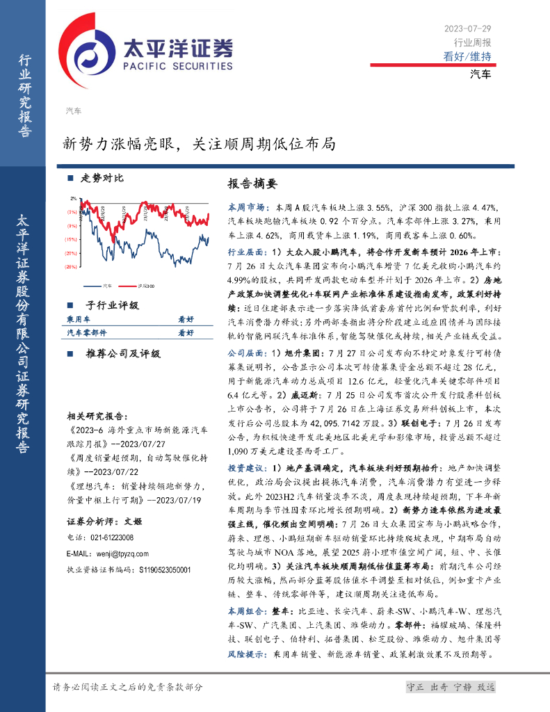 太平洋证券:汽车行业周报:新势力涨幅亮眼,关注顺周期低位布局.pdf
