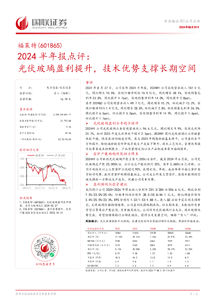 国联证券:福莱特(601865)-2024半年报点评:光伏玻璃盈利提升,技术优势支撑长期空间.pdf