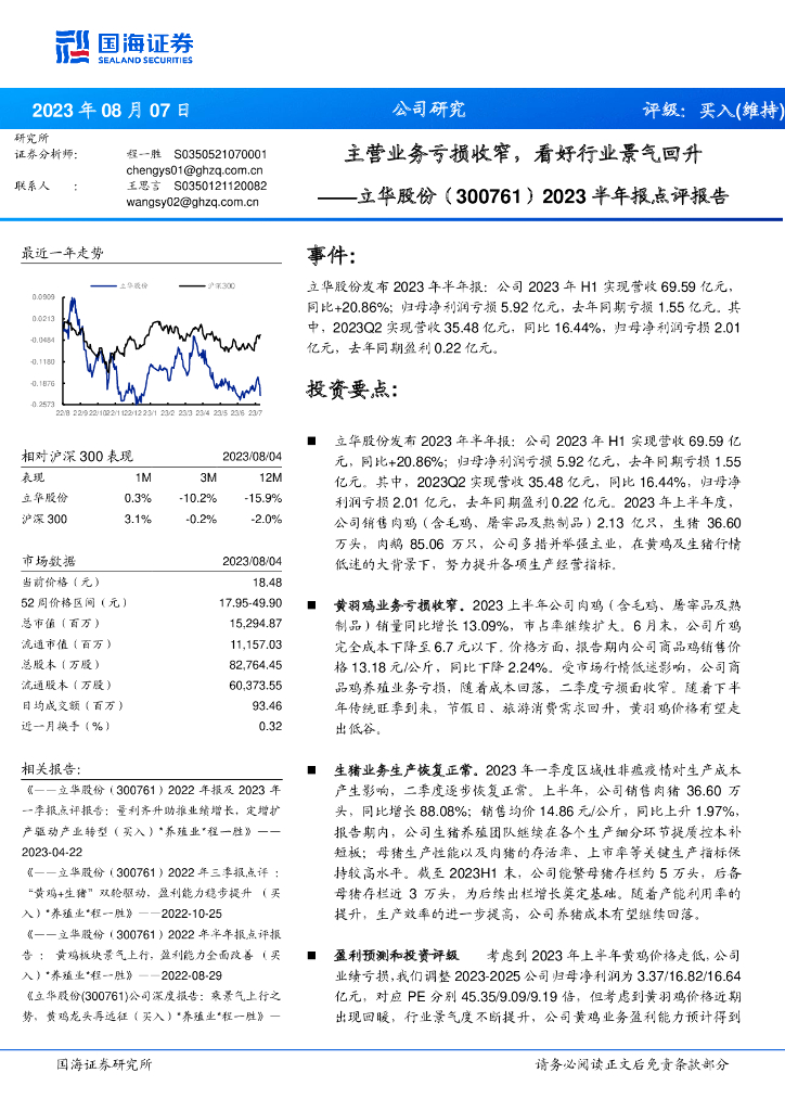 国海证券:立华股份(300761)-2023半年报点评报告:主营业务亏损收窄,看好行业景气回升.pdf