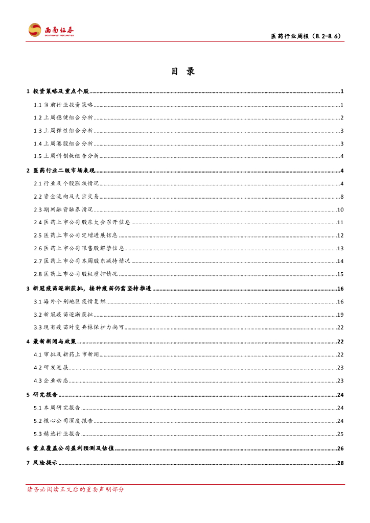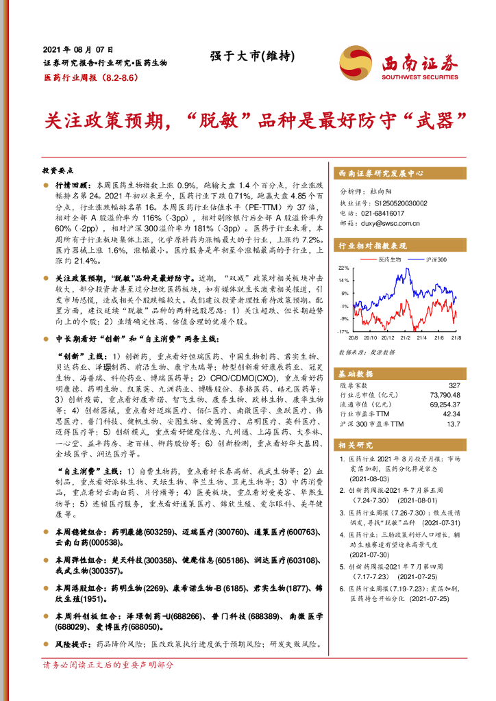 西南证券:医药行业周报:关注政策预期,“脱敏”品种是最好防守“武器”.pdf