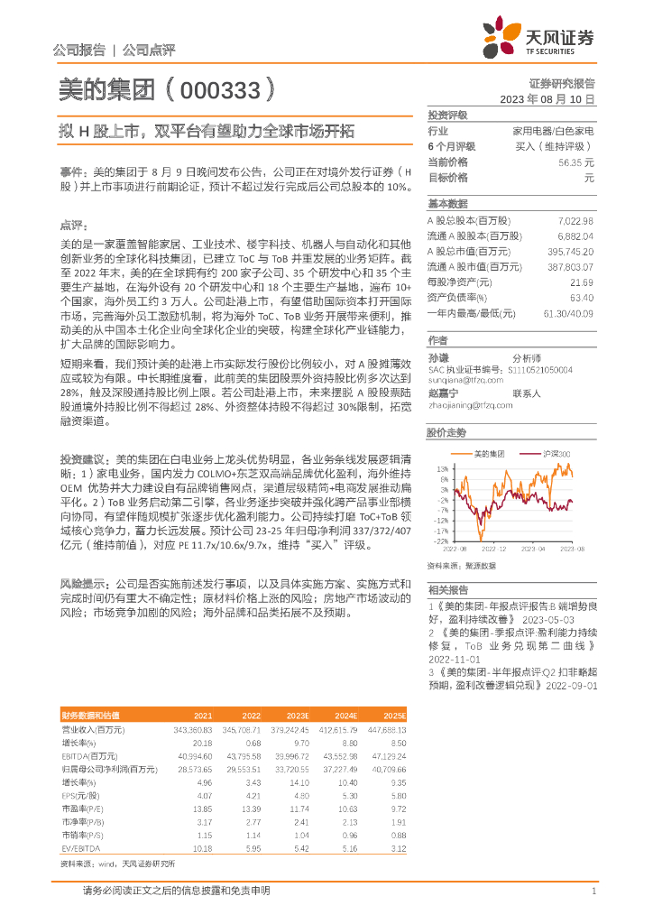 天风证券:美的集团(000333)-拟H股上市,双平台有望助力全球市场开拓.pdf