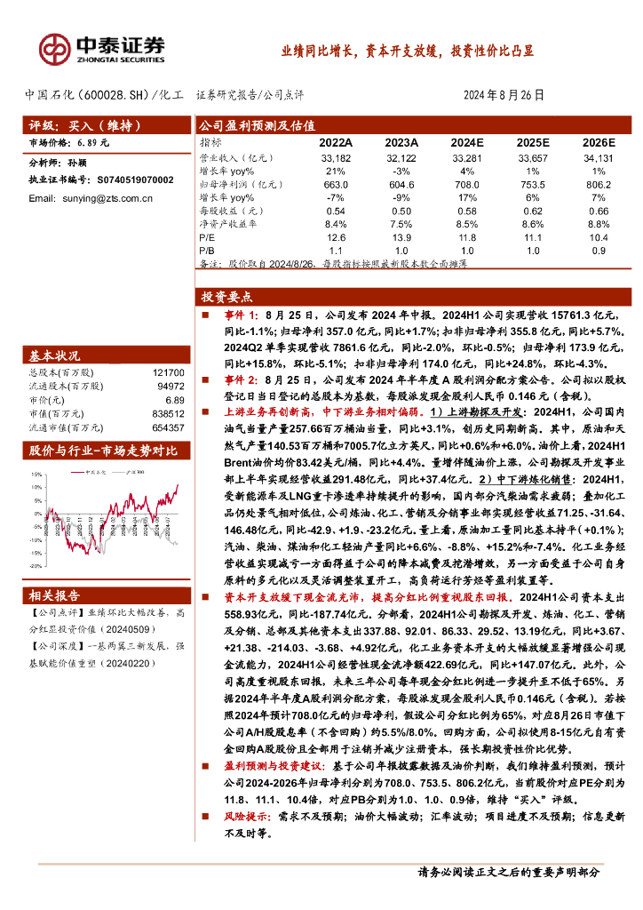中泰证券:中国石化(600028)-业绩同比增长,资本开支放缓,投资性价比凸显.pdf