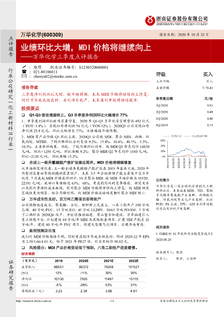 浙商证券:万华化学三季度点评报告:业绩环比大增,MDI价格将继续向上.pdf