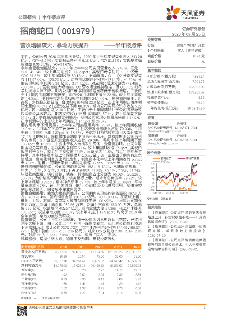 天风证券:招商蛇口(001979)-半年报点评:营收增幅较大、拿地力度提升.pdf