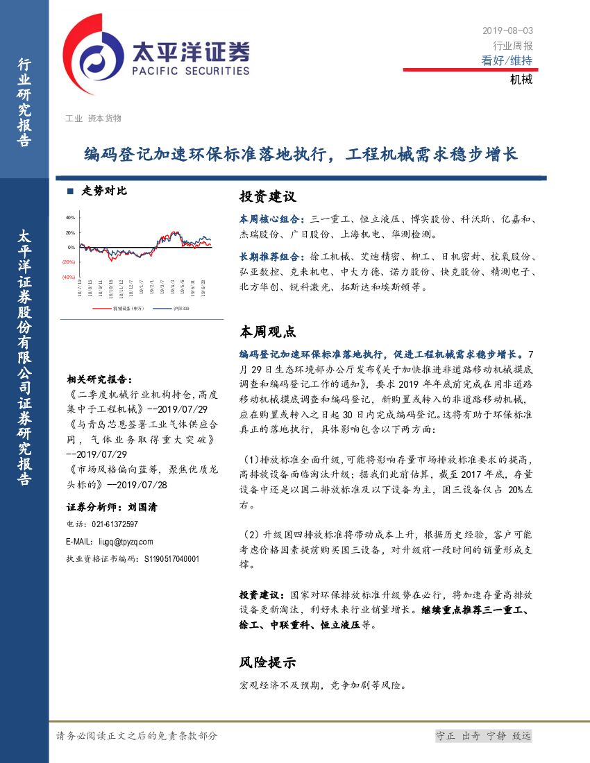太平洋证券:机械行业周报:编码登记加速环保标准落地执行,工程机械需求稳步增长.pdf