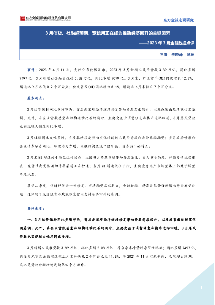 东方金诚:3月信贷、社融超预期,宽信用正在成为推动经济回升的关键因素-2023年3月金融数据点评.pdf