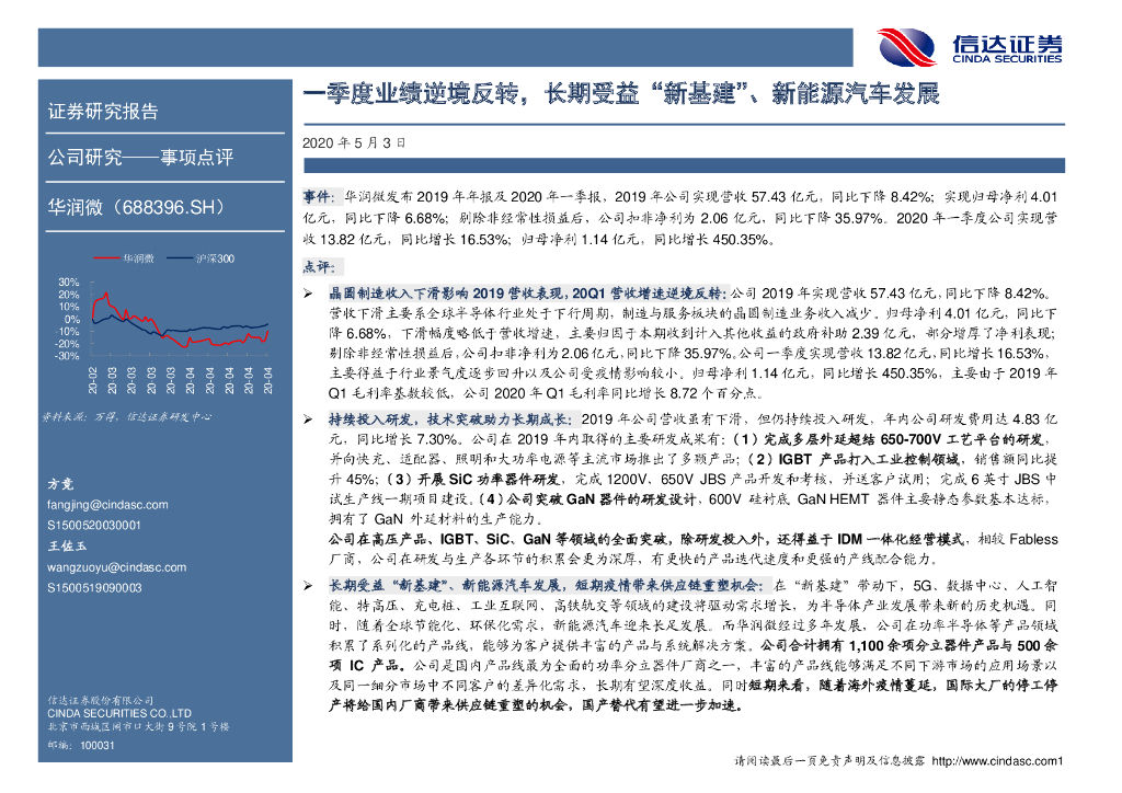 信达证券:华润微(688396)-一季度业绩逆境反转,长期受益“新基建”、新能源汽车发展.pdf