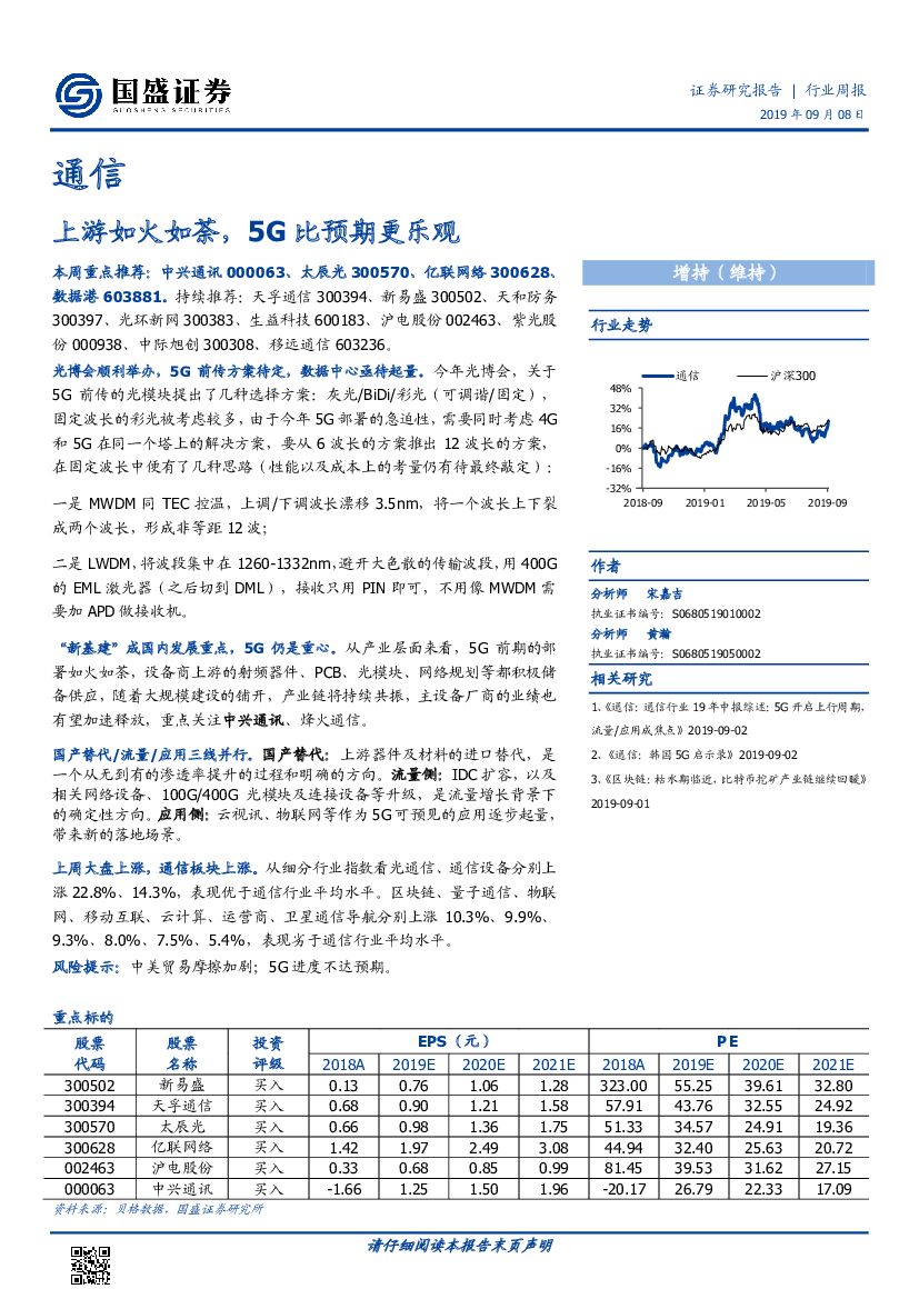 国盛证券:通信行业周报:上游如火如荼,5G比预期更乐观.pdf