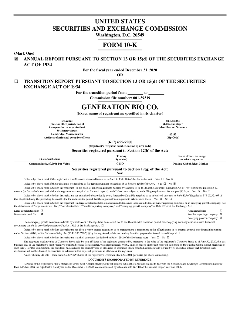 Generation Bio Co.(GBIO)2020财年年度报告(英文版).pdf