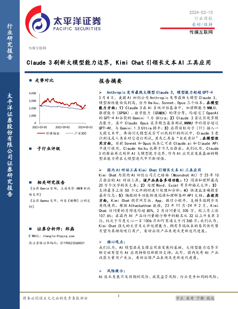 太平洋证券:传媒互联网行业周报:Claude3刷新大模型能力边界,KimiChat引领长文本AI工具应用.pdf