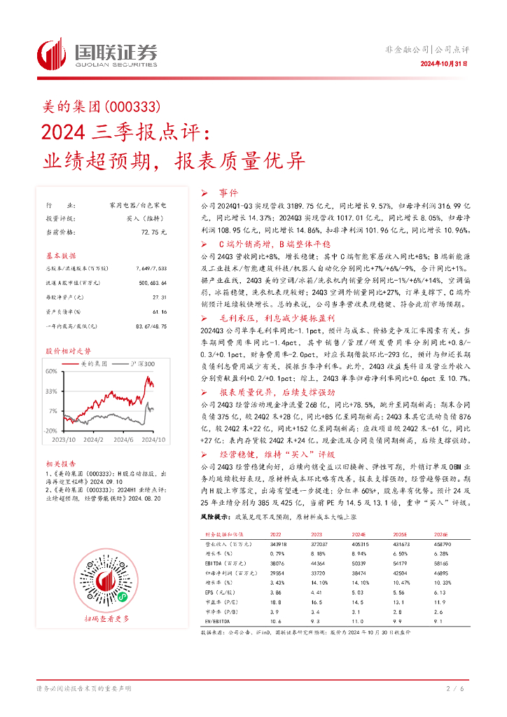 国联证券:美的集团(000333)-2024三季报点评:业绩超预期,报表质量优异.pdf