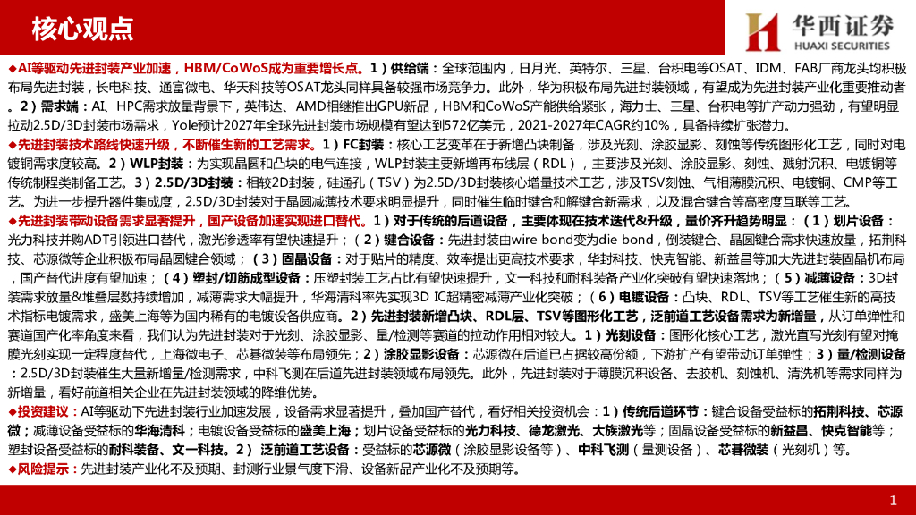 华西证券:先进封装设备行业深度报告:AI等驱动先进封装加速发展,关注优质“卖铲人”.pdf