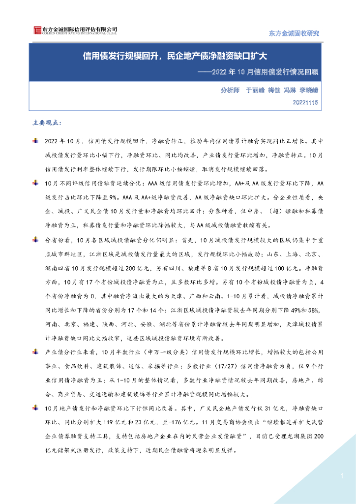 东方金诚: 2022年10月信用债发行回顾:信用债发行规模回升,民企地产债融资缺口扩.pdf