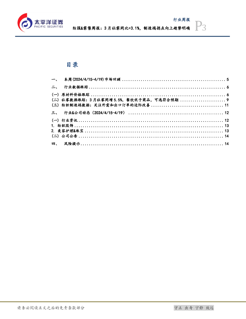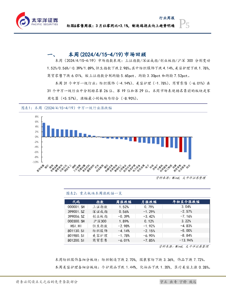 太平洋证券:纺织服装行业周报:纺服&零售周报,3月社零同比+3.1%,制造端拐点向上趋势明确.pdf