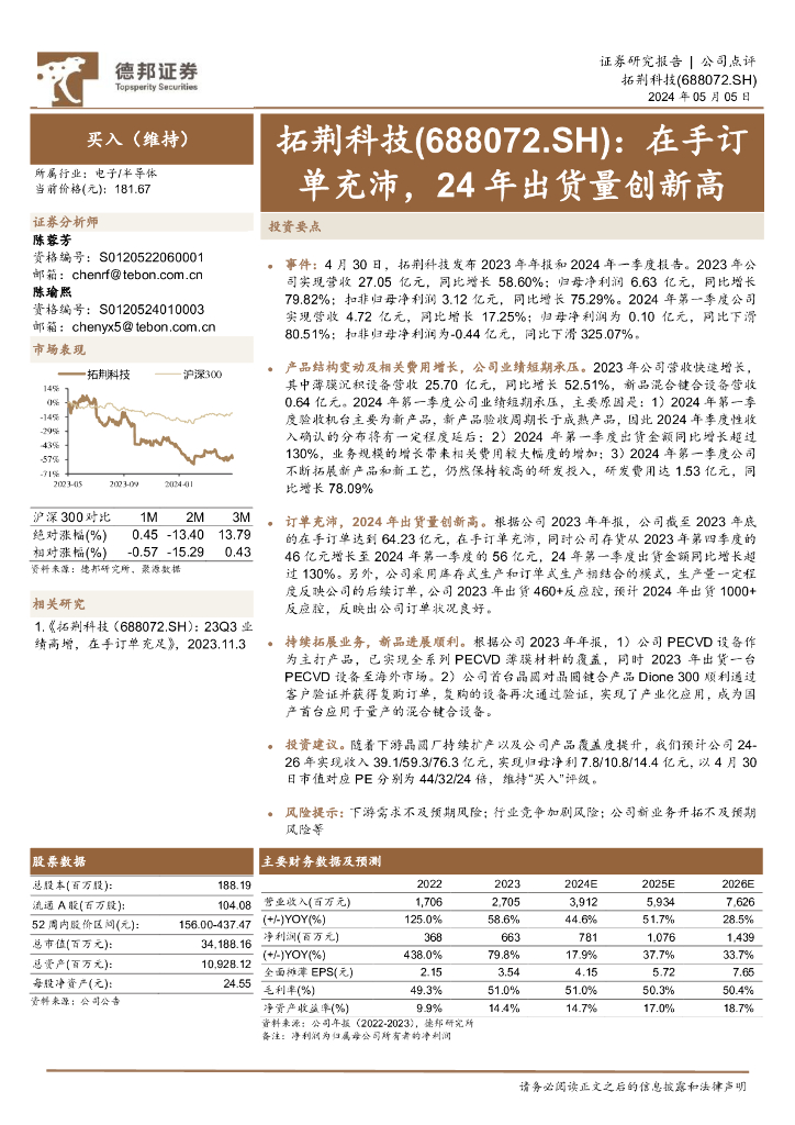 德邦证券:拓荆科技(688072)-在手订单充沛,24年出货量创新高.pdf
