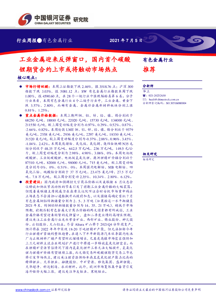 中国银河:有色金属行业周报:工业金属迎来反弹窗口,国内首个碳酸锂期货合约上市或将触动市场热点.pdf