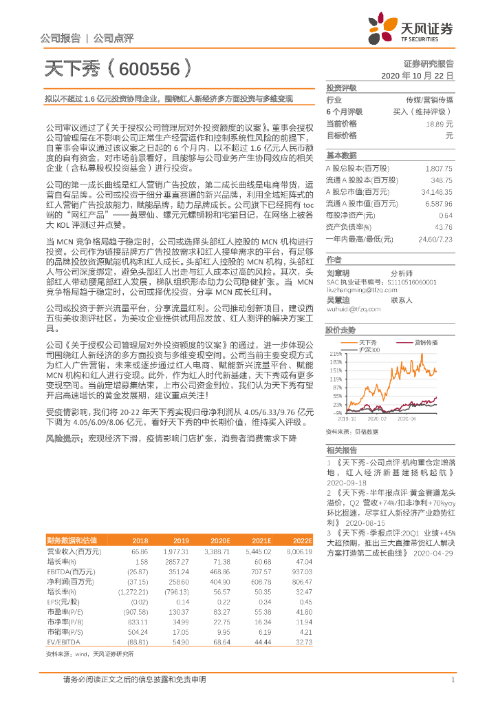 天风证券:天下秀(600556)-拟以不超过1.6亿元投资协同企业,围绕红人新经济多方面投资与多维变现.pdf