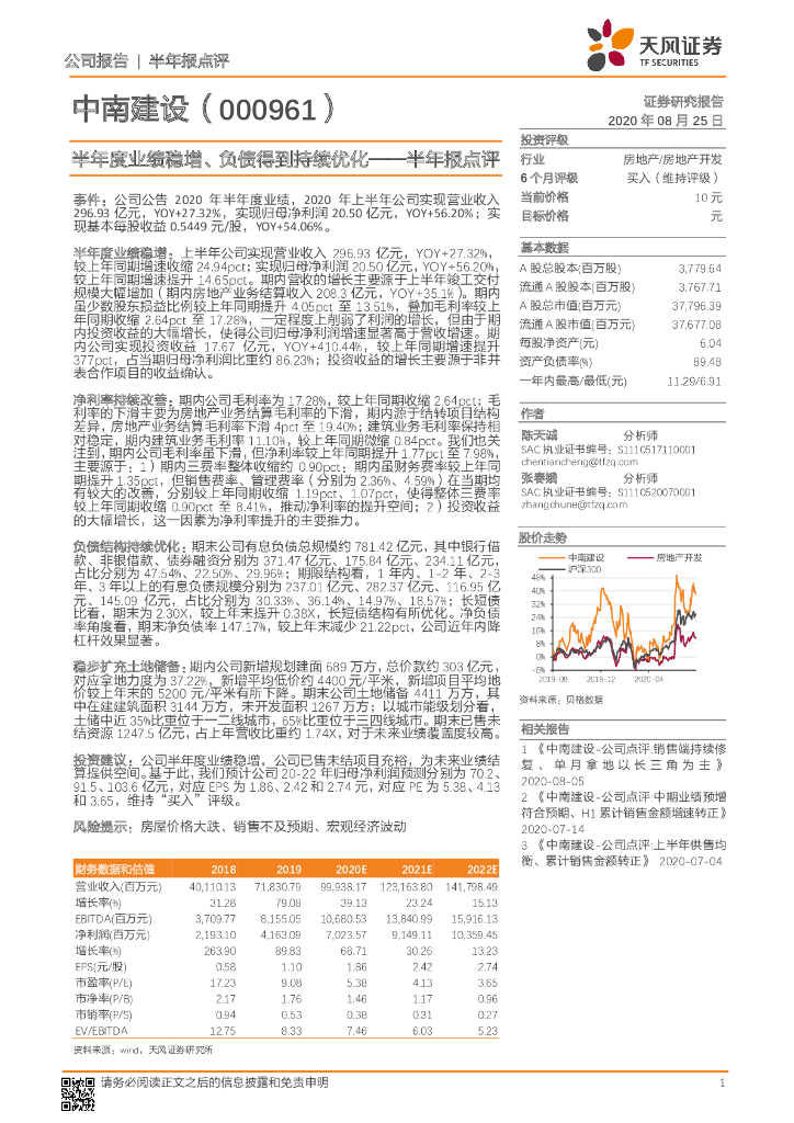 天风证券:中南建设(000961)-半年报点评:半年度业绩稳增、负债得到持续优化.pdf