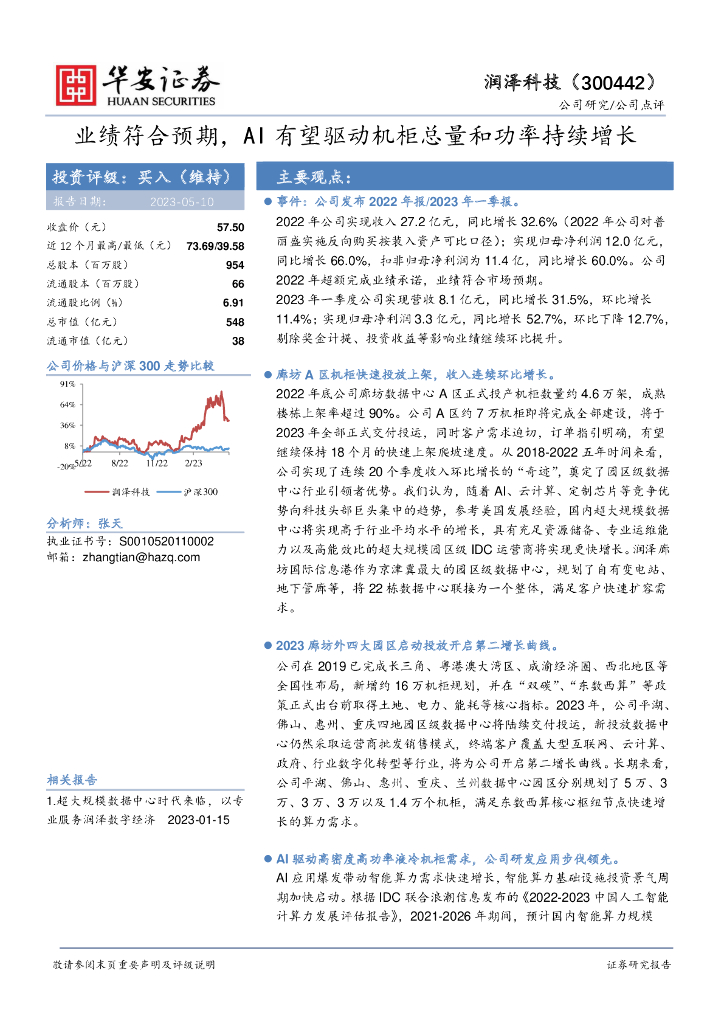华安证券:润泽科技(300442)-业绩符合预期,AI有望驱动机柜总量和功率持续增长.pdf