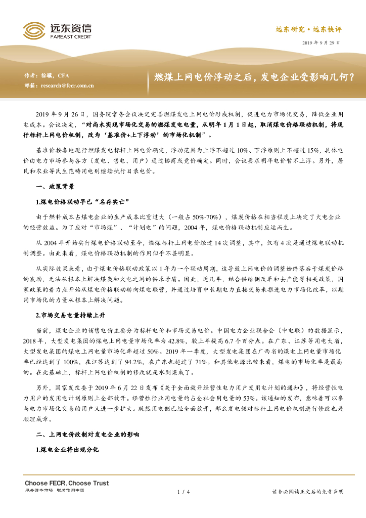 远东资信:燃煤上网电价浮动之后,发电企业受影响几何?.pdf