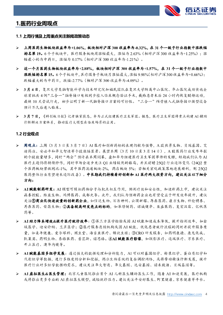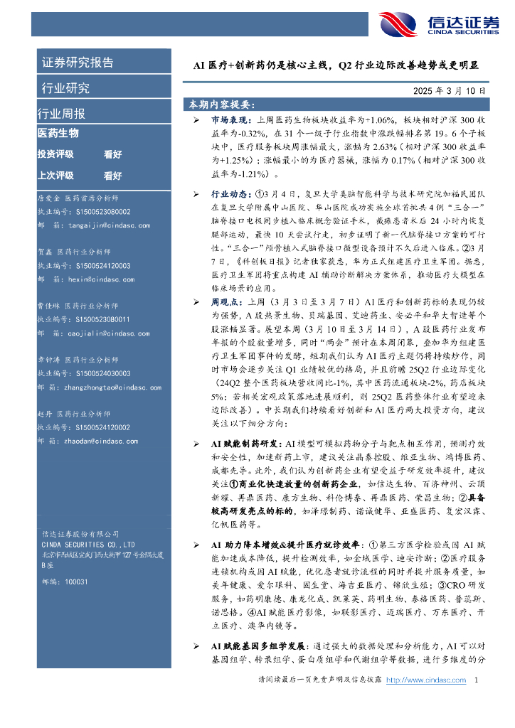 信达证券:医药生物行业周报:AI医疗+创新药仍是核心主线,Q2行业边际改善趋势或更明显.pdf