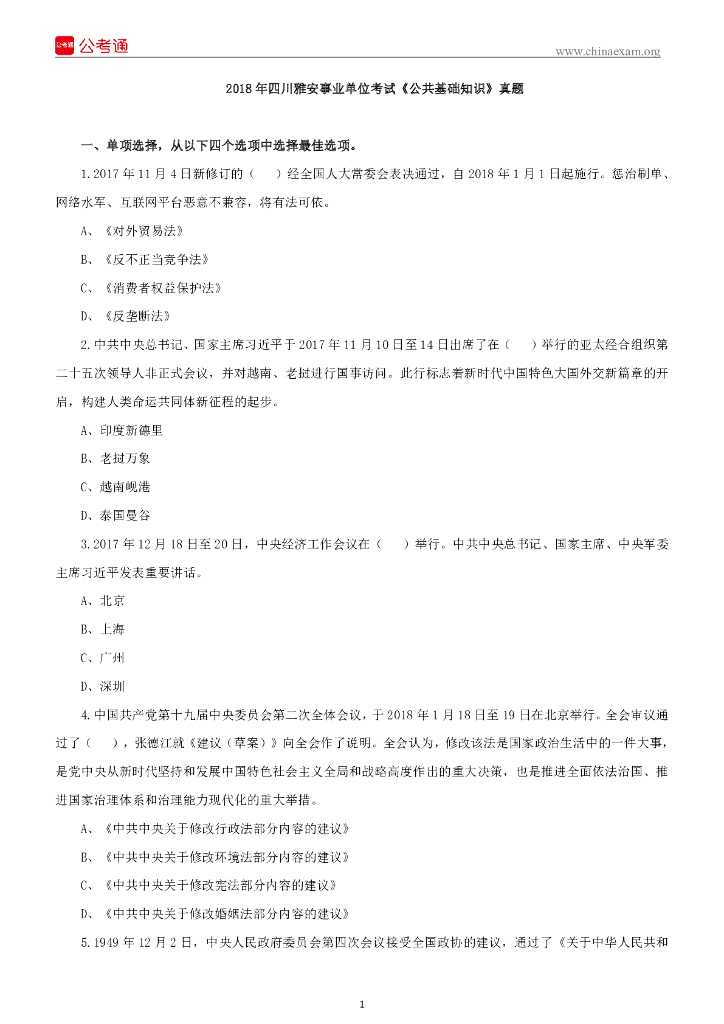 2018年四川雅安事业单位考试《公共基础知识》真题.pdf