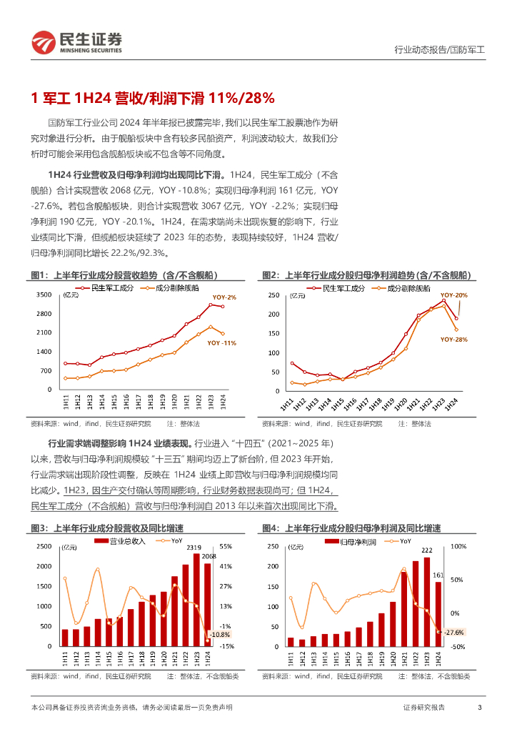 民生证券:军工行业2024年半年报业绩回顾:2Q24业绩环比明显改善;需求复苏信号逐渐增强.pdf