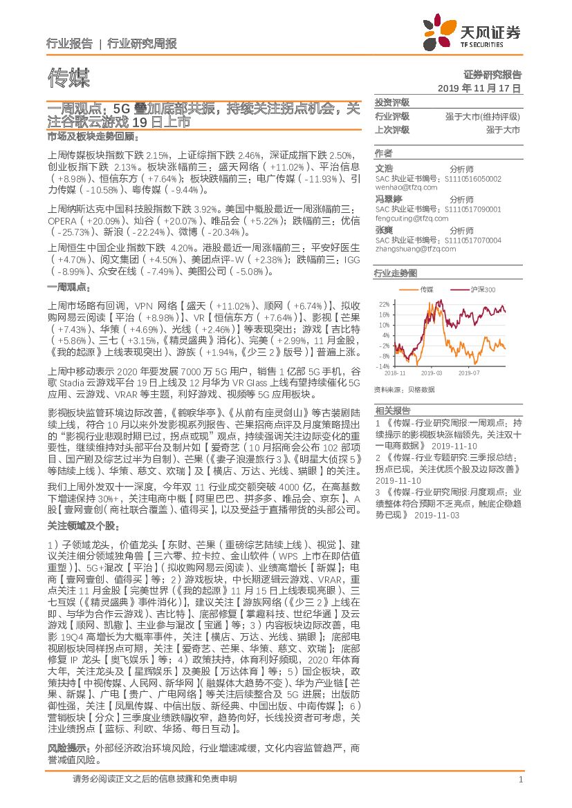 天风证券:传媒一周观点:5G叠加底部共振,持续关注拐点机会,关注谷歌云游戏19日上市.pdf