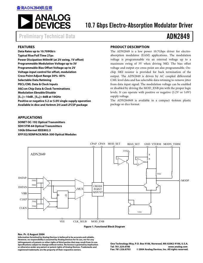 ANALOG DEVICES ADN2849 10.7 Gbps Electro-Absorption Modulator Driver 数据手册.pdf