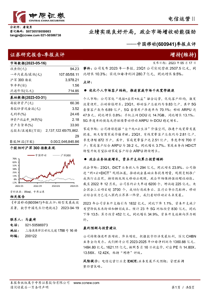 中原证券:中国移动(600941)-季报点评:业绩实现良好开局,政企市场增收动能强劲.pdf