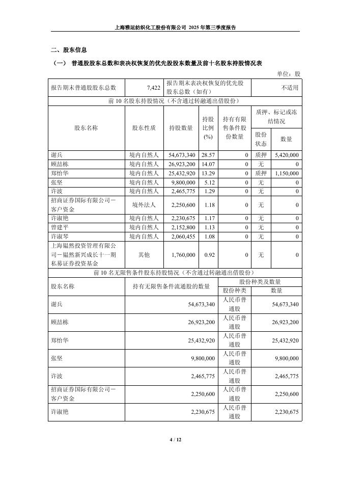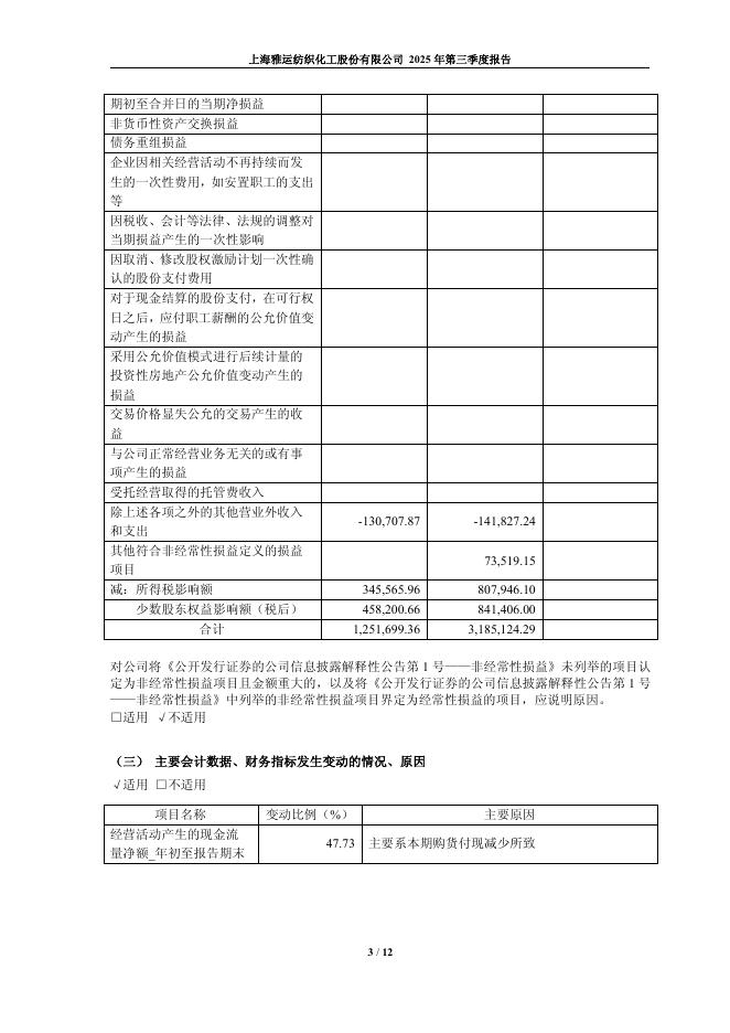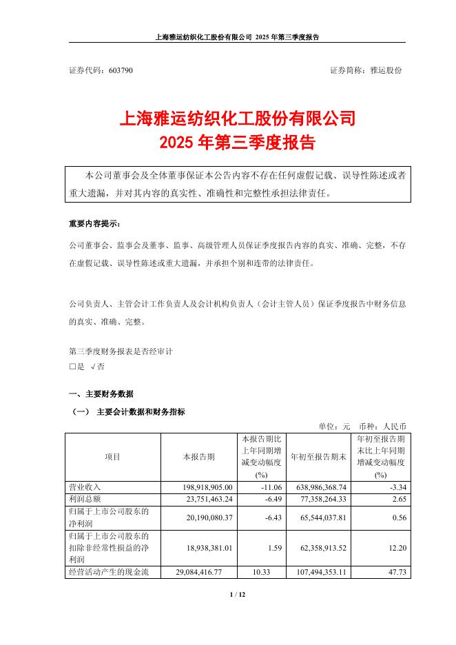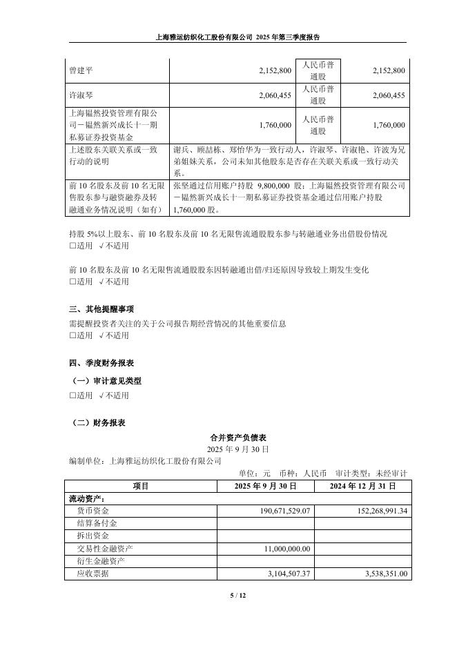 603790-雅运股份:上海雅运纺织化工股份有限公司2025年第三季度报告.pdf